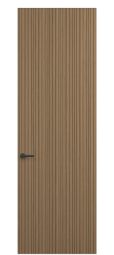 SELECT — коллекция минималистичных дверей с фрезеровкой по натуральному шпону. Рельеф на поверхности полотна создаёт игру света и тени, добавляя пространству динамичности и визуального объёма. Двери SELECT в сочетании со стеновыми панелями и мебельными фасадами, повторяющими лаконичный дизайн, создают единое стилевое решение.