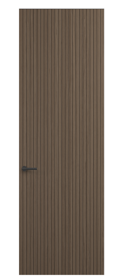 Селект — коллекция минималистичных дверей с фрезеровкой по натуральному шпону. Рельеф на поверхности полотна создаёт игру света и тени, добавляя пространству динамичности и визуального объёма. Двери Селект в сочетании со стеновыми панелями и мебельными фасадами, повторяющими лаконичный дизайн, создают единое стилевое решение.
