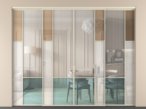 Дополнительно на раздвижную двустворчатую перегородку вдоль стены и четырехстворчатую перегородку внутри проема с двумя неподвижным полотнами можно установить механизм синхронного открывания — при открывании одной створки, вторая открывается автоматически.
